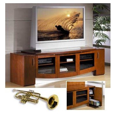 J-30-C-136 Color: Malt Features: -Chimney type ventilation to protect components from over-heating.-Three adjustable shelves for component storage; recessed to allow for component accessibility.-Two tempered glass doors.-Center channel speaker enclosure, with adjustable shelf and interchangeable tempered glass panel for door.-Wire access holes at the back of each shelf. Includes: -Includes adjustable levelers for a perfect fit. Options: -Available in Blossom Cherry, Malt and Espresso finishes.-Eight additional finishes available as special order - Please call our qualified customer service team for details. Special orders cannot be canceled once placed. Construction: -Constructed of solid birch and birch veneer. Specifications: -Two pull-out media trays can hold up to 124 CDs or 96 DVDs. Dimensions: -Credenza Dimensions: 24'' H x 82'' W x 24'' D.-Outer Component Storage Compartment Dimensions: 16'' H x 18.5'' W x 20'' D.-Center Compartment Dimensions: 16'' H x 18.75'' W x 20'' D.