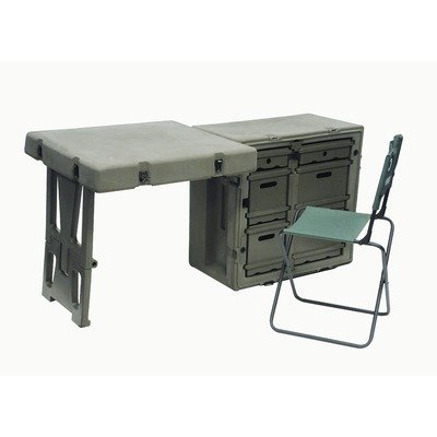 FD3121 Features: -One Large work surface, chair, and drawers.-Six Drawers: two shallow (padlock for extra security), two deep, two file sizes.-One Chair: load rated to 300 lbs. (136 kg) each.-Airtight and watertight.-Made in USA. Includes: -Application includes: Command centers, construction sites and emergency aid shelters. Color/Finish: -Color: OD Green. Dimensions: -Collapsed Form Dimensions: 28'' H x 30.7'' W x 21'' D.-Extended Form Dimensions: 28.5'' H x 61.4'' W x 28.5'' D.
