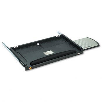 Drawer slides on steel ball bearings and offers three height positions. Slide-out mouse tray with Precise mousing surface. Soft gel wrist rest plus cable management system. Fits most keyboards. Endorsed by the American Physical Therapy Association. Workstation TypeStraight Glide Track Length15-1/2". Color(s): Black; Keyboard Tray Dimensions (W x D): 21" x 12 3/4"; Mouse Tray Dimensions (W x D): 9 1/2" x 8"; Height (+/- Desktop): -3"/-4 3/4".