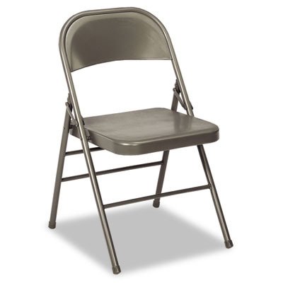 All steel folding chair with contoured back and powder coated finish. Chair Type: Folding and Stacking. Color: Gray. Material: Steel. All-steel folding chair with contoured back and powder-coated finish. Sturdy 7/8inch tubular steel frame with tube-on-tube construction. Double hinges on welded triple-cross braces for additional strength. Contoured back for comfort. Non-marring molded leg caps. 10-year limited manufacturer's warranty