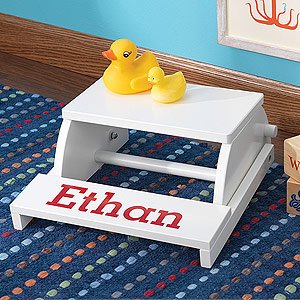 Develop a sense of independence and responsibility in your toddler with our Kid's Step & Sit Flip Stool. Encourages hand washing and teeth brushing without assistance. Also useful in the kitchen when the kids want to help, or just watch.This handy and sturdy, but lightweight stool easily goes from bathroom to kitchen or anywhere else your little one could use extra height. If they tire out, simply change the stool into a chair by flipping the first step over for a little seat they can call theirs alone!Child's name will be custom printed for all to see in your choice of 3 fonts and 5 imprint color options. Choose white or natural finish to match any home decor. Versatile as a chair or a step stool. Easy to clean and carry. Just the right size, measuring 12 1/2"W x 13 1/2"D x 6"H. Sturdily constructed of wood to withstand years of play. No assembly required. NOTE: Due to size this item ships separately from all other items ordered. A shipping surcharge will be added to regular shipping.