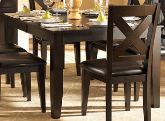 Adorn your dining area with Crown Point Collection. This grand scale casual dining in warm merlot finish is as strong and durable as they are stunning. Table top is constructed of mango veneer with strong support tapered legs. Attractive "X" back dining chair with comfortable leather-look dark brown seat completes the unsophisticated streamlined look. Dimensions: