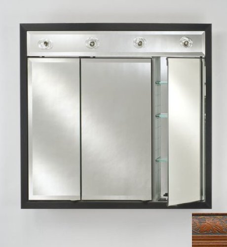 Afina Signature cabinets are made of rust proof satin anodized aluminium. They have no visible hinges and feature a three mirror design. The adjustable glass shelves are engineered to the highest standards of today's technology for long lasting durability and elegance. Collection: Signature. Style: Traditional. Recessed triple door medicine cabinet. Available in over 40 frame styles and colors. Dimensions: 34" W x 34" H with 4 light sockets. 0.75" Perimeter bevel mirror standard. 0.37" Thick adjustable glass shelves. Up to 60 watts per socket. Rust proof gray satin anodized aluminum construction. 3 Mirror design (front bevel mirror, mirror behind door and inside mirror back). Frame will add to overall dimensions, please see specifications sheet for exact outside dimensions by frame style. Cabinet measures 4.37" in depth. With recessed mount, less then 4" go into wall, the frame is completely flush to the wall. Door has pivot hinge which pivots into cabinet body. Hinge is securely screwed into the door for ease of removal and remounting the door. Frame is independent of door and is mounted to the perimeter of cabinet body. Frame Shape: Rectangle. Lighting: Top Lighting. Shape: Rectangle Medicine Cabinets. Finish: Parliament Mahogany.