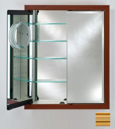 3/4" Perimeter bevel mirror standard. 3/8" Thick adjustable glass shelves. Gray satin anodized aluminum construction. 3 Mirror design (front bevel mirror, mirror behind door and inside mirror back). Outside dimension: 31" x 36". Rough wall opening: 28" x 33". Shelves: 8 Glass shelves. Finish: Roman Gold.