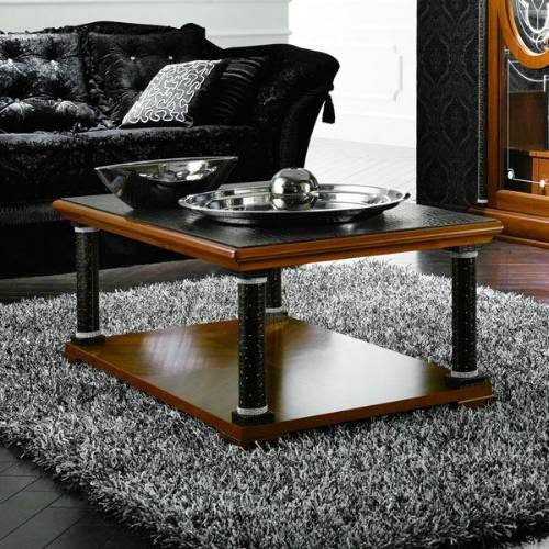Platinum Coffe Table.,Elegant contemporary design Genuine crystal accents Crocodile effect top and pillars Solid wood construction for lasting durability and support,Assembly Required: No Collection: Platinum Country of Origin: Italy Cubes: 16.25 Finish: Light Walnut Height: 18 Length: 28 Materials: Wood, leather effect top Weight: 105 Width: 47