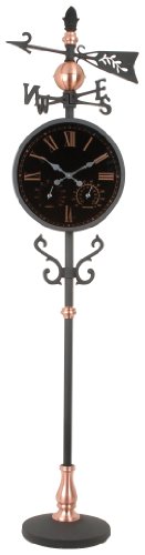 Copper Accented Weather Station Matte black finished aluminum construction with weighted base and copper accents. Intended for portable use on the deck, patio, balcony or indoors! Large clock face with small thermometer and humidity gauge inset below. 77.1" high x 22" wide.