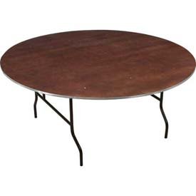 Midwest E Series round folding tables can handle years of rough handling while performing flawlessly and looking like new. Tops are constructed of durable, lightweight, stained and sealed, 3/4" plywood core and are supported by a hardwood runners attached with through bolts to the top. Tops finished with a protective walnut stain and two layers of clear lacquer. 18 gauge, galvanized steel edging is securely screwed to the underside ot the top at regular intervals for added durability. Extra thick, 14 gauge, 1.05" diameter steel, wishbone legs with added vertical reinforcement stand up to heavy use without bending and are capped with high impact plastic glides to protect floors. The high quality, spring-bolt actuated leg braces assure long life for easy set-up and tear down. 68.00 L. 68.00 W. 3.00 H.
