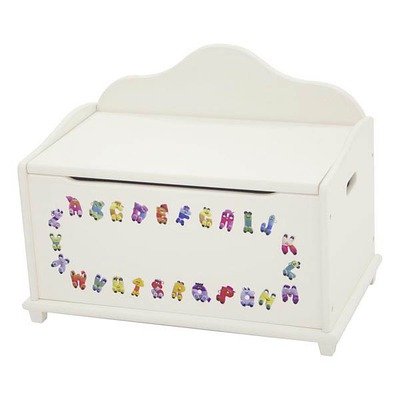 The Bassettbaby Eurpsville Toy Chest has a white finish on Asian hardwoods and veneers. It includes 3 sets alphabet charter stickers to personalize. Top also acts as a bench.