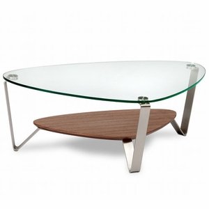 BDI's Dino™ Small Coffee Table by Louis A. Lara (2011) has a versatile triangular shape. Made with a tempered glass top and a beveled lower shelf with satin-nickel finished steel legs. Available in Natural Walnut, Espresso Stained Oak or Gloss White.