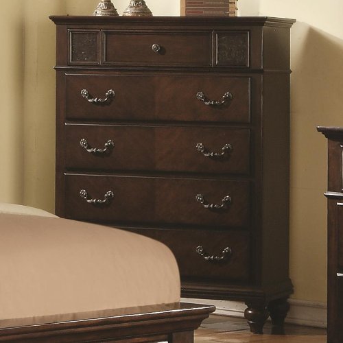 Sidney 5-Drawer Chest by Coaster Fine Furniture Poplar solids and cherry veneers with a dark cherry finish make this eye catching drawer chest a perfect addition to your bedroom. 5 spacious drawers allow for maximum storage of clothes, blankets and other bedroom accessories. Turned bun feet and antique bronze hardware give this already attractive chest and addition touch of traditional style and grace. Features: Traditional Style Turned Bun Feet 5 Storage Drawers Detailed Panel Carving Felt-Lined Top Drawer Antique Bronze Hardware French and English Dovetail Poplar Wood Solids Dark Cherry Finish Cherry Veneers Assembly Required Ships Via Freight Dimensions: 41" W x 17.75" D x 54.5" H