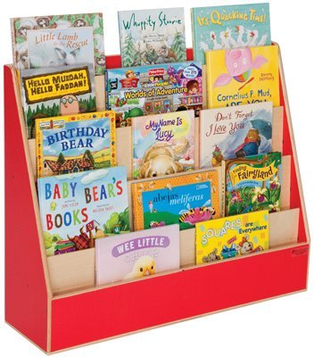 34300R Color: Strawberry Red Features: -Book display stand.-With 4 additional storage shelves on back side.-Made in USA.-All surfaces and back are 100 percent Healthy Kids plywood. Construction: -Solid 11 ply baltic birch plywood construction. Color/Finish: -Tuff gloss finish.-5 Sloping shelves provide ample space to display books or store coloring books. Warranty: -Manufacturer provides lifetime warranty.