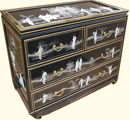 Shiny Black & Pearl inlaid Oriental dresser with 4 drawers, glass top, felt lini is the suggested of of google search engine with these keywords. "Heaven & Earth"