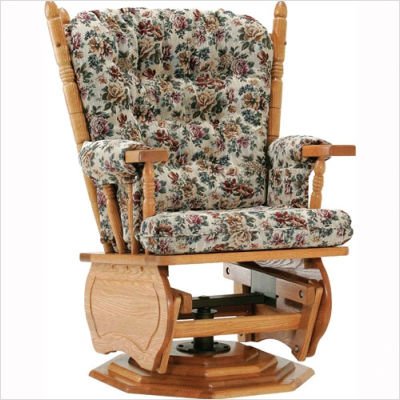 [***INCLUDED IN THIS SET: (1)Oak Four Post Glider, (1)Oak Stationary Swivel Ottoman] Base: Swivel, Fabric: Basil, Finish: Harvest Shown in Antique Fabric and Harvest finish with optional swivel base, padded arm rests, and matching ottoman Features: -Huge selection of fabrics to choose from.-Seat cushions upholstered with solid foam foundation.-Glue and pin-nails applied to every part.-High quality ball bearings rated at 30,000 RPM.-Support braces to strengthen the base.-Optional matching 151 solid oak ottoman, wood swivel base, and arm pads. Options: -Available in white wash, natural, harvest, golden oak, or cherry finish. Construction: -Constructed of solid oak.-Samson webbing seat construction to ensure years of comfort. Assembly Instructions: -An average of 120 screws in every chair assembly. Dimensions: -Seat height: 19''.-Overall dimensions: 41'' H x 19'' W x 20'' D.
