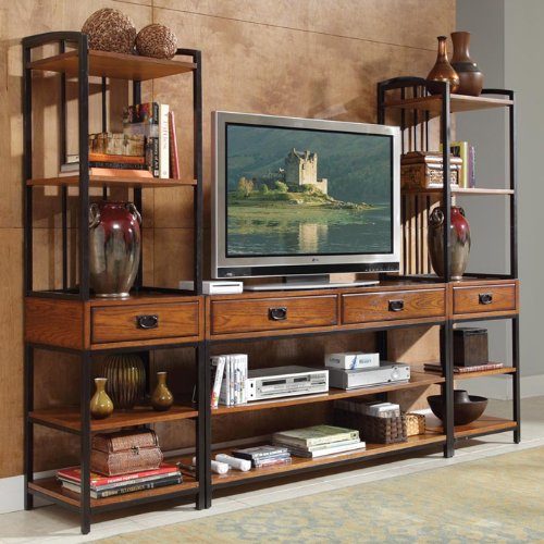 Finish:Oak Reminiscent of the American Craftsman Era with understated style and simplicity, the Modern Craftsman Entertainment Collection marries a traditional, multi-step distressed finish on poplar solids and oak veneers with new age, brown metal accents.The Modern Craftsman Gaming Entertainment Center provides much needed storage space in an entertainment space. Three piece set includes the gaming entertainment center and two media towers Four storage drawers and six fixed shelves Gaming console: 54'W x 18'Back to Front x 31.5'H Media Tower Dims: 20W x 18Back to Front x 72H